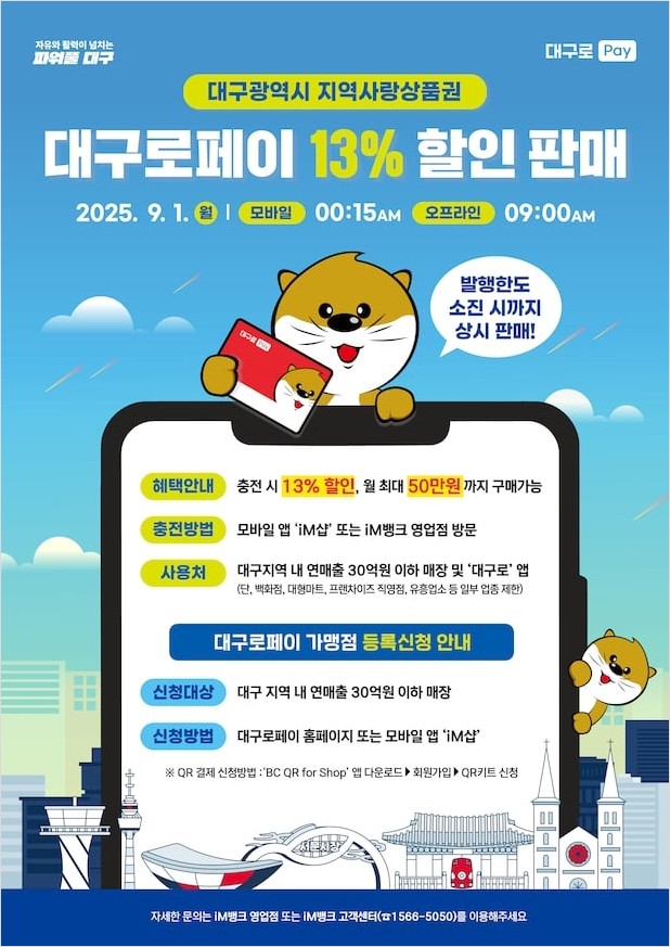 대구 시내 전통시장, 식당, 카페, 학원 등 다양한 곳에서 현금처럼 사용할 수 있는 대구로페이. 13%라는 역대급 할인 혜택으로 가계비도 절약하고, 침체된 지역 경제 활성화에도 기여하는 '착한 소비'에 동참해 보세요. 아직 충전하지 않으셨다면, 조기 소진되기 전에 서두르시는 것을 강력 추천합니다!